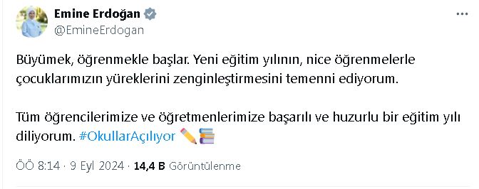 Emine Erdoğan, sosyal medya hesabından #OkullarAçılıyor etiketiyle yaptığı paylaşımda, “Büyümek, öğrenmekle başlar. Yeni eğitim yılının, nice öğrenmelerle çocuklarımızın yüreklerini zenginleştirmesini temenni ediyorum. Tüm öğrencilerimize ve öğretmenlerimize başarılı ve huzurlu bir eğitim yılı diliyorum” dedi.
