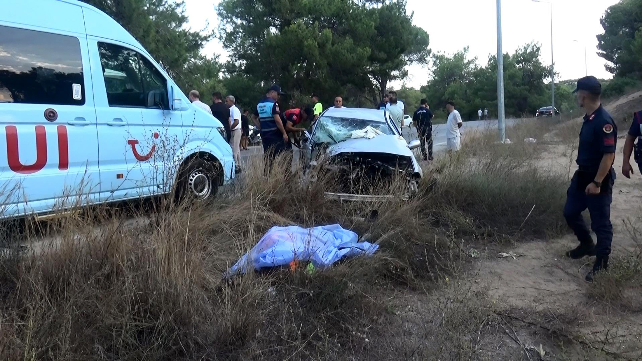 • ANTALYA'nýn Manavgat ilçesinde cankurtaran olarak çaýþan Batuhan Aytar'ýn (28) kullandýðý otomobil, sollama yaptýðý sýrada önce karþý yönden gelen tur otobüsüyle, ardýndan solladýðý midibüsle çarpýþtý. Emniyet kemeri takýlý olmadýðý için ön camdan fýrlayan Batuhan Aytar, olay yerinde hayatýný kaybetti. (Ýbrahim Kýyak) Fotoðraf: Mithat ABAKAN/ Manavgat (Antalya), (DHA)