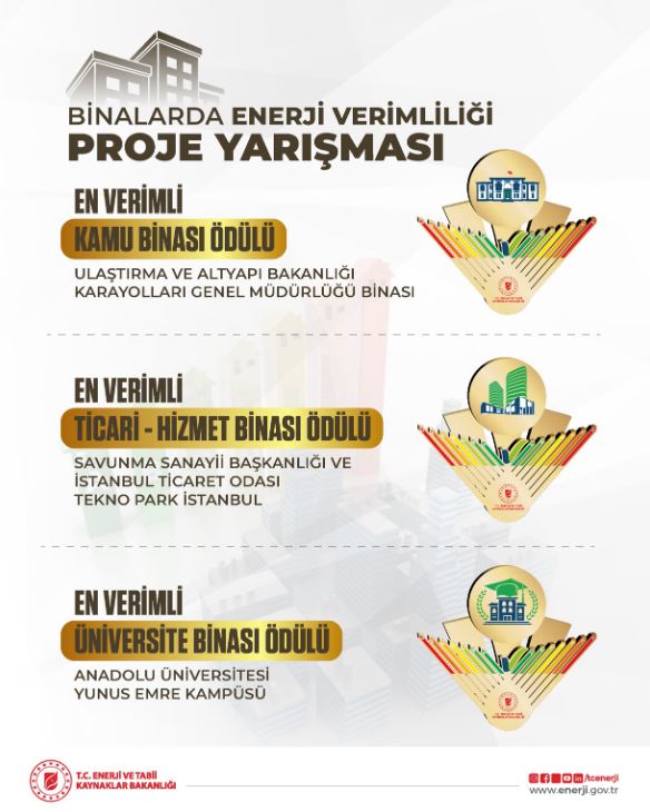 Enerji ve Tabii Kaynaklar Bakanlığından yapılan açıklamaya göre; üç ayrı kategoride düzenlenen BENVER-2 Yarışmasının kazananları 125 kamu, hizmet ve ticari bina arasından seçildi. Jüri, yarışmada yer alan binalarda hangi enerji verimliliği adımlarının atıldığını inceledi. Binaların enerji verimliliğine katkı sağlayan uygulamaları tek tek tespit edildi. Yarışmada yapılan incelemeler sonucunda 3 bina ödüle layık görüldü. Ticari-Hizmet Binaları kategorisinde, Savunma Sanayii Başkanlığı ile İstanbul Ticaret Odası ortaklığında faaliyet gösteren TEKNOPARK İstanbul, En Verimli Ticari-Hizmet Binası ödülünü kazandı. Kamu Binaları kategorisinde ise Ulaştırma ve Altyapı Bakanlığına bağlı Karayolları Genel Müdürlüğünün binası öne çıktı. LED aydınlatma dönüşümü, ısıtma sistemlerinin optimizasyonu ve soğutma için yapılan uygulamalarla dikkat çeken Karayolları Genel Müdürlüğü, En Verimli Kamu Binası ödülünü alarak birinci oldu.