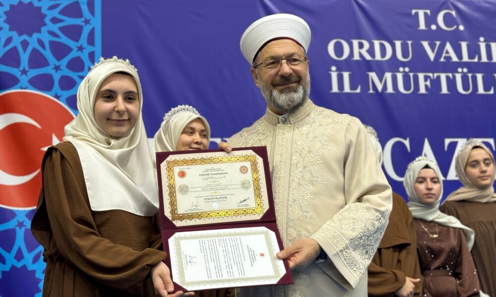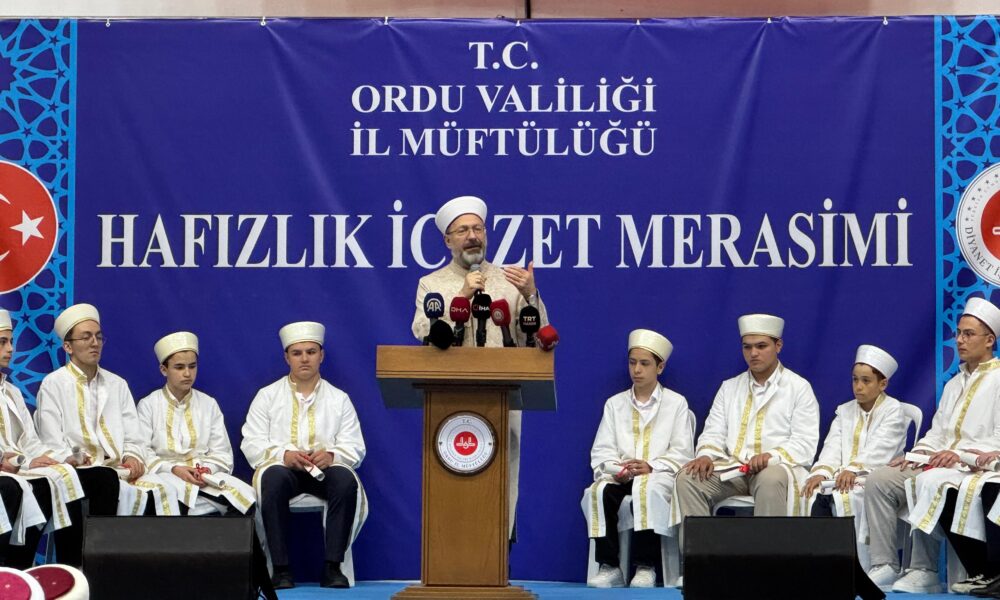 Altınordu ilçesi Recep Kara Spor Salonu’nda İl Müftülüğü tarafından düzenlenen hafızlık icazet törenine katılan ve 452 hafıza icazet belgesi takdim eden Diyanet İşleri Başkanı Ali Erbaş, hafızların ömrü boyunca insanları iyiliğe davet edeceklerini belirterek, “Bugün, 452 hafızımızın icazet merasimi vesilesi ile bir aradayız. Peygamber Efendimiz (S.A.V.) buyuruyor ki, ‘Sizin en hayırlınız, Kur’an’ı öğrenen ve öğretenlerinizdir’ demiştir. Cenabıhak, Kur’an-ı Kerim’i Peygamber Efendimize en büyük mucize olarak göndermiştir. Kur’an’ın dışında dünyada başka hiçbir kitaba başından sonuna bu şekilde ezberlenmek nasip olmamıştır. Dünyada ne Tevrat ne de İncil hafızı var. Ama milyonlarca Kur’an hafızı var. Sadece ülkemizde icazetnamesini almış ve hak etmiş 255 bin hafızımız var. Bir o kadar da icazetnamesiz olan hafızımız var. Nereden baksanız yarım milyon Kur’an hafızına sahip bir ülkeyiz çok şükür” dedi.