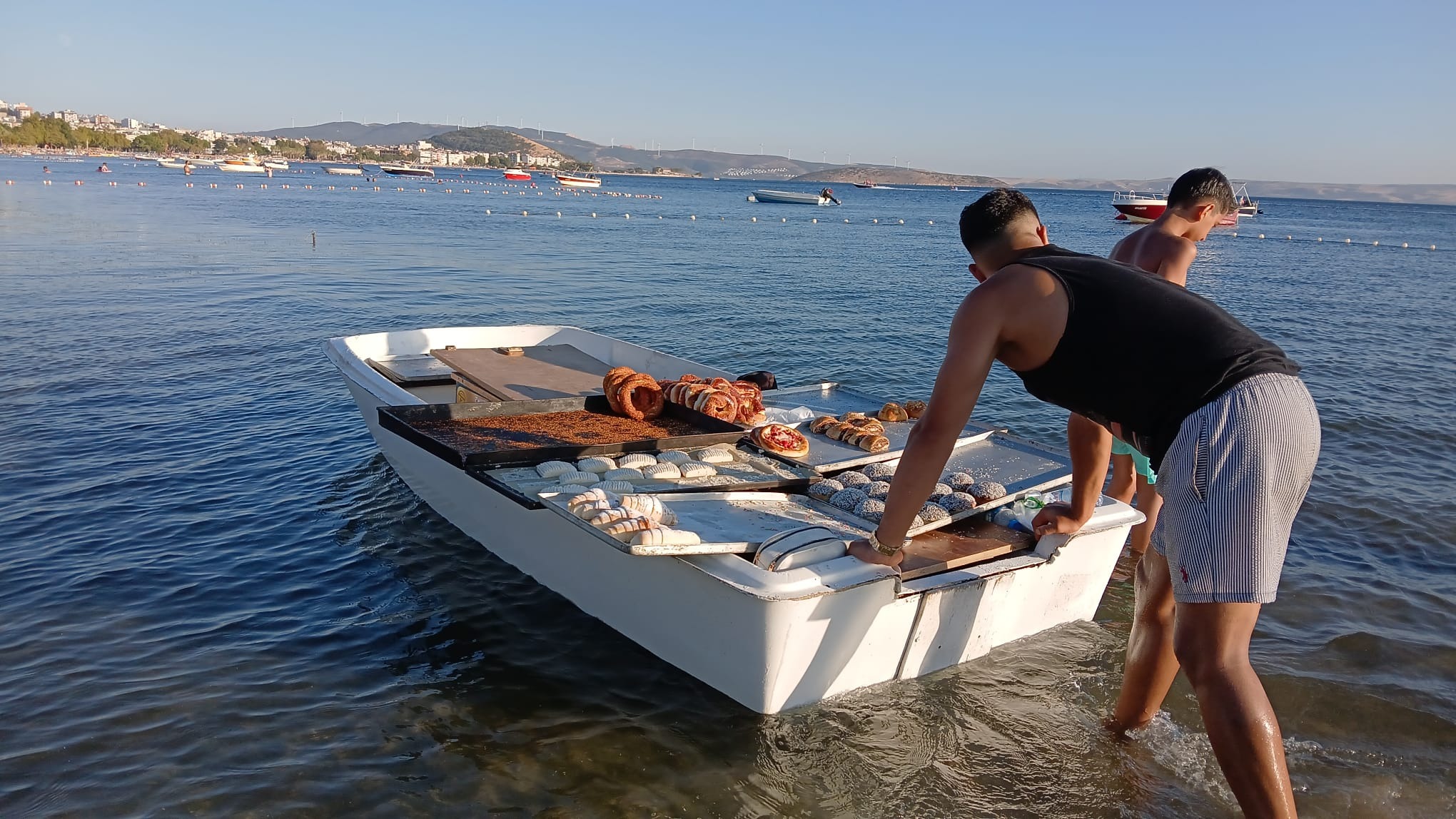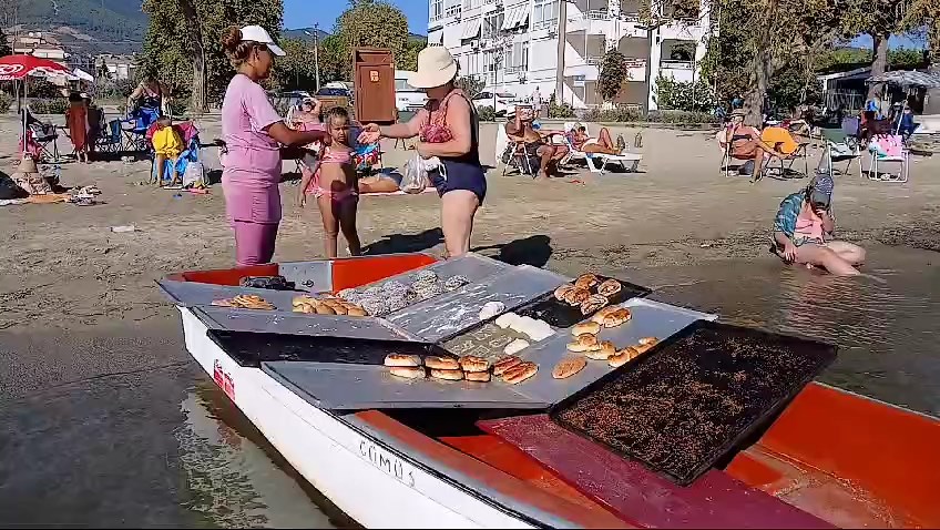 Pastanede yevmiye ile çalıştığını söyleyen Ahmet Candursun da “Genellikle öğleden sonra satışa çıkıyoruz. Açma, simit, kek, Alman pastası, çikolatalı pasta, poğaça ve unlu kurabiye çeşitlerim bulunuyor. Bunları 20 lira ile 50 lira arasında satıyorum. Kullandığım kayık ile sahilden 50 metre açılıp, motor ile turlara katılan kişilere de satış yapıyorum” diye konuştu.