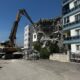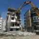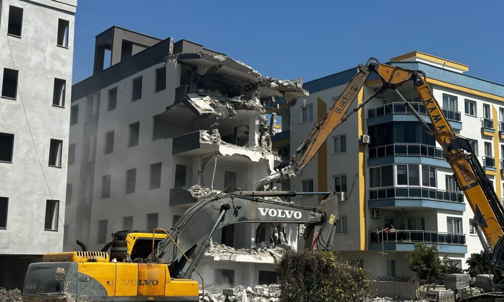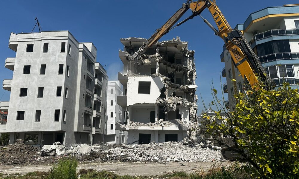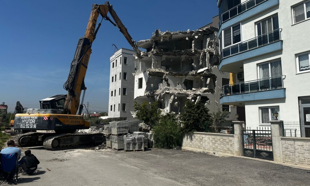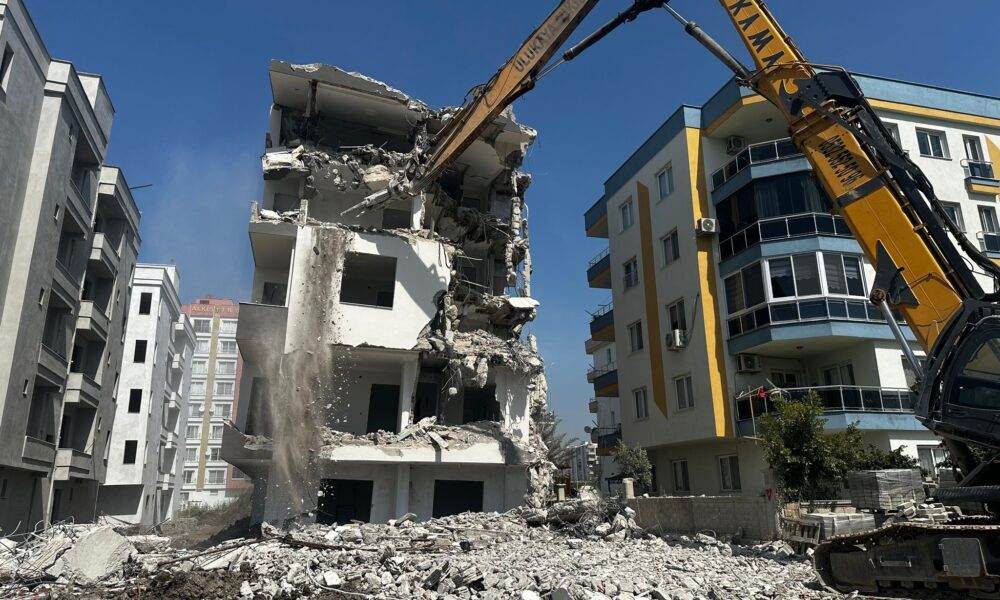 Erdemli’de yan yatan bina yıkılıyor