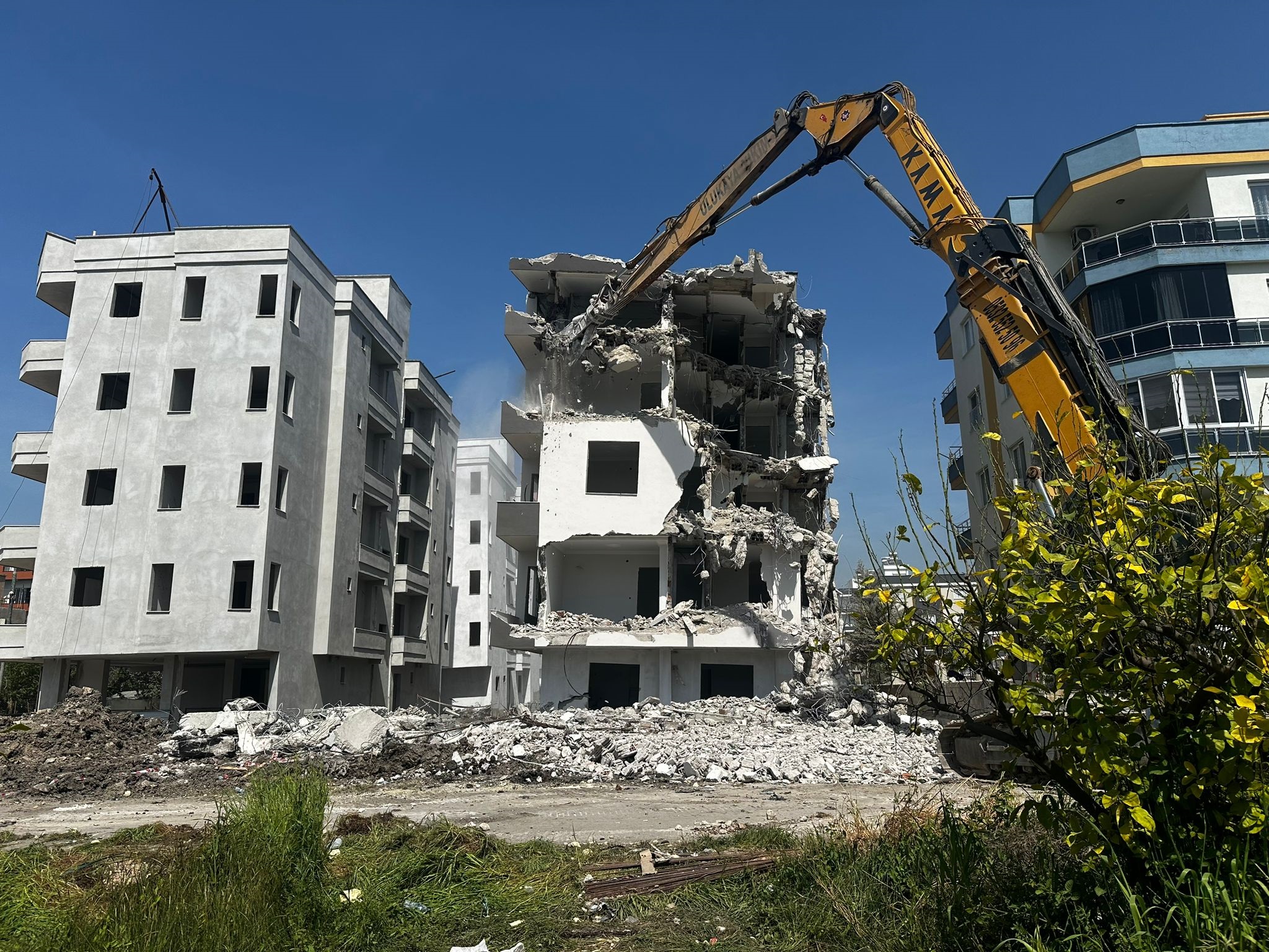 MERSİNin Erdemli ilçesinde yana doğru yatan 4 katlı binanın yıkımına başlandı.İlçeye bağlı Akdeniz Mahallesi Muhammet Çavuş Sokaktaki yapımı tamamlanan 4 katlı bina yan yatmaya başladı. Durumun fark edilmesi üzerine iş makinesi ile binanın yan tarafı kazıldı. Ertesi gün, bina bu kez diğer tarafa doğru yan yatmaya başladı. Bu kez de diğer taraf iş makinesi ile kazılarak önlem alındı. Tamamen yan yatma tehlikesi bulunan 4 katlı blok ile ilgili Erdemli Belediyesi ekipleri bölgeye giderek inceleme yaptı. Ekiplerin incelemesinden sonra temelin izinsiz olarak kazılmasından kaynaklı yan yatmanın meydana geldiği belirtilerek, bina mühürlendi. Mühürlenme sonrasında belediye tarafından binanın yıkılması kararlaştırılarak, ilgili firmaya bildirildi. Zabıta ekipleri eşliğinde belediye birimlerinin son incelemeyi yapmasının ardından bugün binanın yıkımına başlandı. İş makinesi ile önce balkonlar ardından da üst katların diğer kısımları makaslandı. Makaslama sonrası binanın duvarlarının yıkılmasına geçildi. Yıkımın 2-3 gün sürmesinin beklendiği belirtildi.