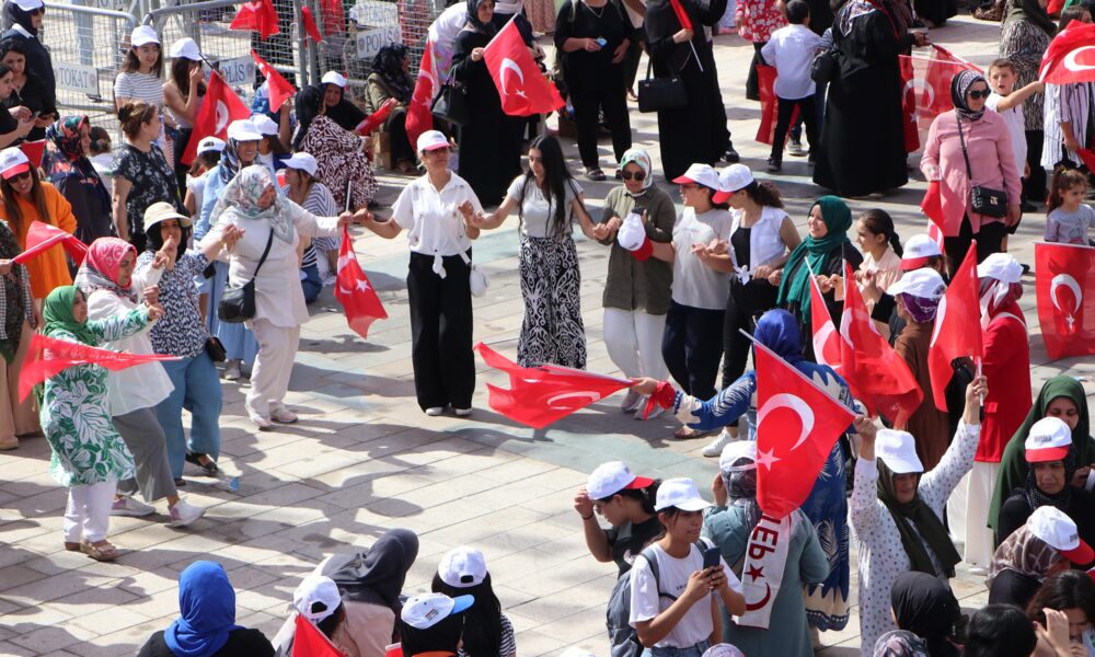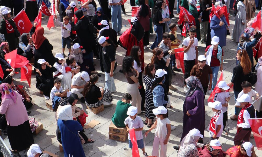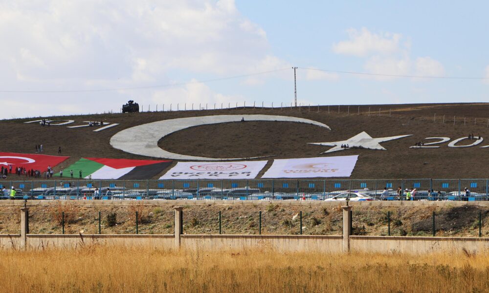 Öte yandan tören alanına bakan, ay yıldız figürün bulunduğu ve yanında 1071-2071 yazısının olduğu alana dev Türk bayrağı ile İsrafil’in işgali altında bulunan Filistin bayrağı açıldı.