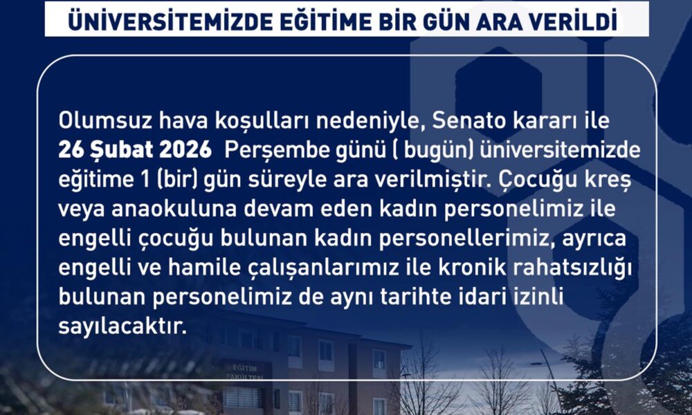 Rektörlük tarafından yapılan yazılı açıklamada, “Olumsuz hava koşulları nedeniyle Senato kararı ile 26 Şubat 2026 Perşembe günü üniversitemizde eğitime bir gün süreyle ara verilmiştir. Çocuğu kreş veya anaokuluna devam eden kadın personellerimiz, ayrıca engelli ve hamile çalışanlarımız ile kronik rahatsızlığı bulunan personelimiz de aynı tarihte izinli sayılacaktır” denildi.