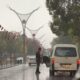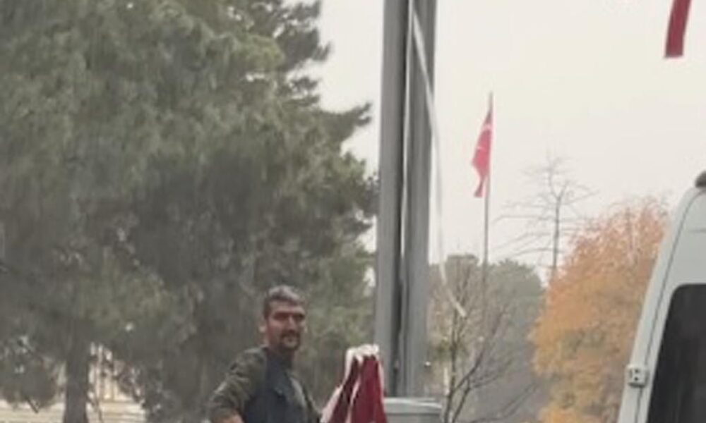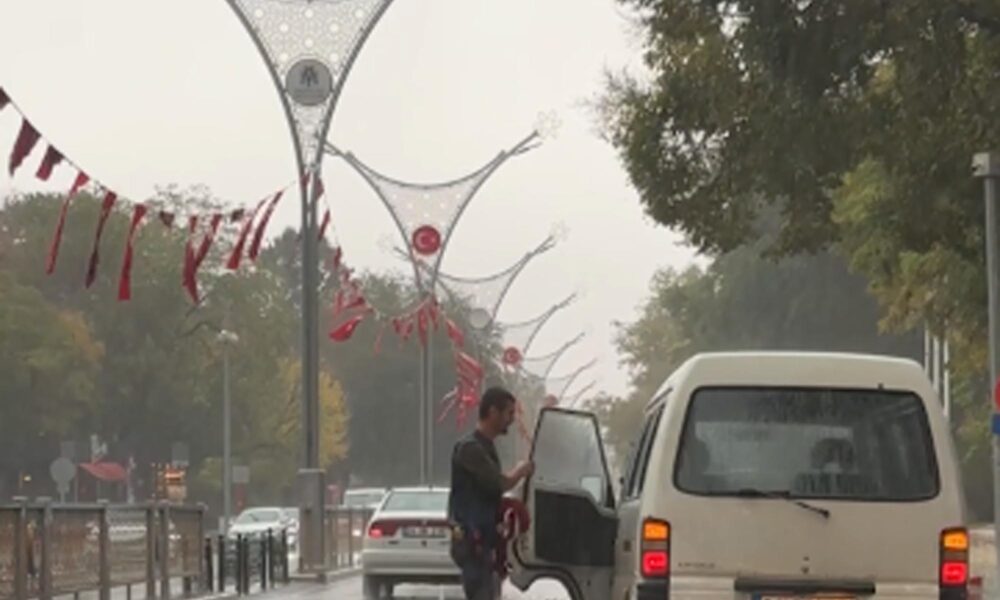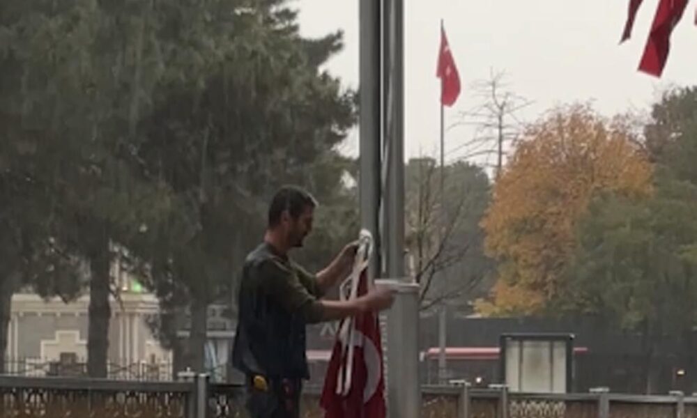Erzincan’da yağmur altında yere düşen bayrakları topladı