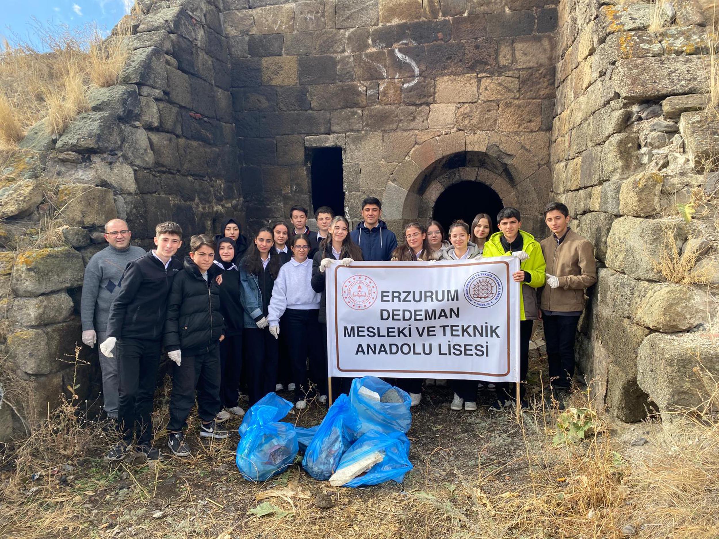 • Erzurum Turizm Tanıtım ve Kalkınma Derneği yöneticileri, Dedeman Turizm Mesleki ve Teknik Anadolu Lisesi öğrencileriyle Küçük Kiremitlik Tabyası'ndaki çöpleri topladı. Fotoğraf: Erzurum,(DHA)