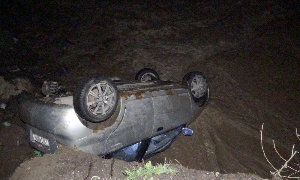 • Erzurum’da sürücüsünün yolu şaşırdığı otomobil dereye düşerek ters döndü. Araçta bulunan 3 kişi ekiplerin çalışması sonucu çıkarıldı. Fotoğraf: Oktay POLAT / Erzurum(DHA)