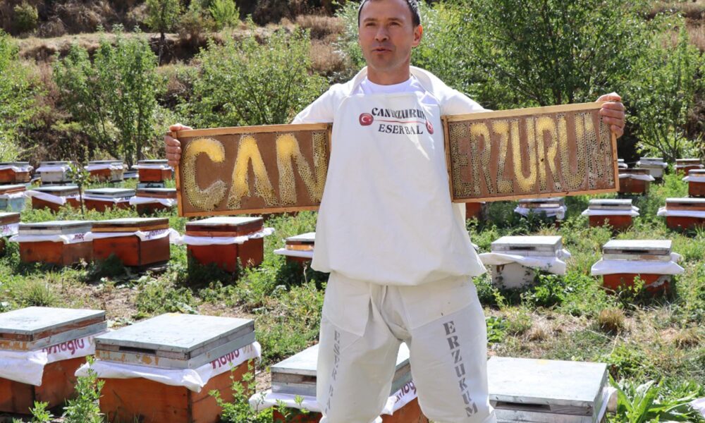 Şenkaya ilçesine bağlı kırsal Doğanköy Mahallesinde 20 yıldan beri arıcılık yapan Alim Eser, ilkbaharda kovanlarına bal mumuyla Filistin, Can Erzurum, Dadaş gibi kelimeler yazdı. Alim Eserin kovanlara yerleştirdiği petekleri arıların işlemesiyle yazılan kelimeler ortaya çıktı. İsrailin uyguladığı katliam sebebiyle Filistine destek için adını peteğe yazdığını ifade eden Eser, Erzurum ve Şenkaya isimlerini de tanıtım için işlediğini söyledi. Yeni başlayan eğitim öğretim yılında da okuma-yazmanın önemini dikkat çeken Alim Eser, “Tamamen organik, şekersiz bal üretiyorum. İlkbaharda bal mumuyla yazıları işlediğim peteklere arılar bal yapınca kelimeler tam anlamıyla ortaya çıktı” dedi.
