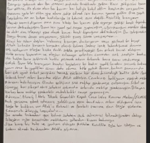 2 sayfalık mektupta, “Başınız sağ olsun. Ölüm haberini aldığımda kahroldum. Kendime gelmem çok zaman aldı. Kendime sürekli nasıl böyle oldu soruları soruyorum. Allah bizlere sabır ve dayanma gücü versin. Mahkemede tek bir yalan konuşmayacağım. Suçum neyse cezamı çekmeye razıyım. Ama şunu bilin ki karımı güle oynaya geldiği kendi topraklarıma defnedeceğim. Bunun için yasal yol neyse yapacağım. Mümkün olmasa dahil suç işlemeyi göze alarak, karımı kendi toprağıma defnedeceğim. Bu isteğimden, dünya tersine dönse, gökteki güneş sönse vazgeçmem. Açık görüşüme gelebilirsiniz; Allahın rahmeti ve bereketi üzerinize olsun. Özgür günlerde kavuşmak dileğiyle hoş çakalın” ifadeleri yer aldı.