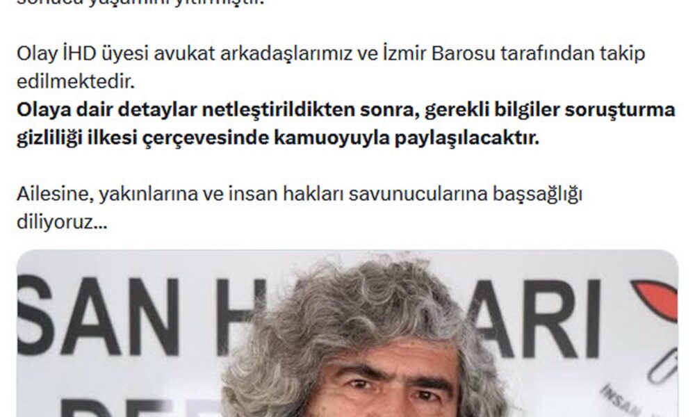İHD Genel Merkezi, sanal medya hesabından yaptığı açıklamada, “Geçmiş dönemlerde İHD İzmir Şubesi Eş Başkanlığı ve İHD Bölge Temsilciliği yapan arkadaşımız avukat Ali Aydın bugün uğradığı saldırı sonucu yaşamını yitirmiştir. Olay İHD üyesi avukat arkadaşlarımız ve İzmir Barosu tarafından takip edilmektedir. Olaya dair detaylar netleştirildikten sonra, gerekli bilgiler soruşturma gizliliği ilkesi çerçevesinde kamuoyuyla paylaşılacaktır. Ailesine, yakınlarına ve insan hakları savunucularına başsağlığı diliyoruz” diyerek, olayı duyurdu.