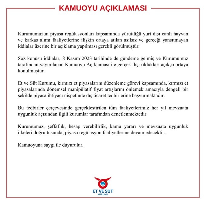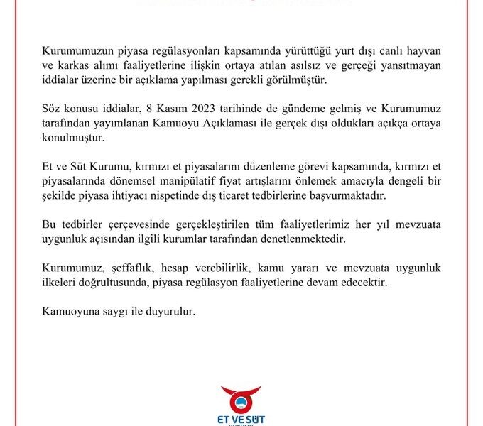 ESKnin sosyal medya hesabından yapılan açıklamada, “Kurumumuzun piyasa regülasyonları kapsamında yürüttüğü yurt dışı canlı hayvan ve karkas alımı faaliyetlerine ilişkin ortaya atılan asılsız ve gerçeği yansıtmayan iddialar üzerine bir açıklama yapılması gerekli görülmüştür. Söz konusu iddialar, 8 Kasım 2023 tarihinde de gündeme gelmiş ve Kurumumuz tarafından yayımlanan kamuoyu açıklaması ile gerçek dışı oldukları açıkça ortaya konulmuştur. Et ve Süt Kurumu, kırmızı et piyasalarını düzenleme görevi kapsamında, kırmızı et piyasalarında dönemsel manipülatif fiyat artışlarını önlemek amacıyla dengeli bir şekilde piyasa ihtiyacı nispetinde dış ticaret tedbirlerine başvurmaktadır. Bu tedbirler çerçevesinde gerçekleştirilen tüm faaliyetlerimiz her yıl mevzuata uygunluk açısından ilgili kurumlar tarafından denetlenmektedir. Kurumumuz, şeffaflık, hesap verebilirlik, kamu yararı ve mevzuata uygunluk ilkeleri doğrultusunda, piyasa regülasyon faaliyetlerine devam edecektir” denildi.