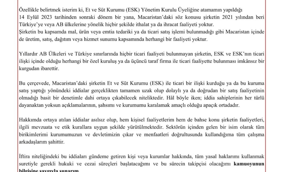 Öte yandan, konuyla ilgili açıklama yapan ESK Genel Müdürü ve Yönetim Kurulu Başkanı Mücahid Taylan, basın-yayın organlarında yer alan, kendisi ve Macaristanda faaliyet gösterdiği iddia edilen bir şirketle ilgili ortaya atılan iddiaların gerçeği yansıtmadığını ifade etti. Taylan, “Son günlerde bazı basın-yayın organlarında şahsım ve Macaristanda mukim şirket hakkında gerçeği yansıtmayan çeşitli iddialara yer verildiği görülmüştür. Kamuoyunun doğru bilgilendirilmesi amacıyla bu açıklamayı yapma gereği hasıl olmuştur. Özellikle belirtmek isterim ki Et ve Süt Kurumu (ESK) Yönetim Kurulu Üyeliğine atamamın yapıldığı 14 Eylül 2023 tarihinden sonraki dönem bir yana, Macaristandaki söz konusu şirketin 2021 yılından beri Türkiyeye veya AB ülkelerine yönelik hiçbir şekilde ithalat ya da ihracat faaliyeti yoktur. Şirketin bu kapsamda mal, ürün veya emtia tedariki ya da ticari satış işlemi bulunmadığı gibi Macaristan içinde de üretim, satış, dağıtım veya hizmet sunumu kapsamında herhangi bir faaliyeti yoktur. Yıllardır AB ülkeleri ve Türkiye sınırlarında hiçbir ticari faaliyeti bulunmayan şirketin, ESK ve ESKnin ticari ilişki içinde olduğu herhangi bir özel kuruluş ya da üçüncü taraf firma ile ticari faaliyette bulunması imkansız bir kurgudan ibarettir” dedi.