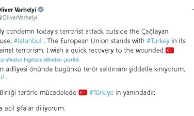 AVRUPA Birliği (AB) Komisyonu’nun Komşuluk ve Genişlemeden Sorumlu Üyesi Oliver Varhelyi, İstanbul Çağlayan Adliyesi önünde gerçekleşen terör saldırısıyla ilgili kınama mesajı yayınlayarak, “Avrupa Birliği terörle mücadelede...