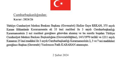 CUMHURBAŞKANI Recep Tayyip Erdoğan’ın imzasıyla Merkez Bankası Başkanlığı’na Fatih Karahan’ın atanmasına ilişkin karar Resmi Gazete’de yayımlandı. Fatih Karahan’ın Cumhurbaşkanı Recep Tayyip Erdoğan tarafından Merkez Bankası Guvernörlüğüne...