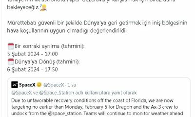 SANAYİ ve Teknoloji Bakanı Mehmet Fatih Kacır, Alper Gezeravcı’nın yer aldığı Ax-3 misyonunun dünyaya geri dönüşünün olumsuz hava koşulları nedeniyle ertelendiğini açıkladı. Bakan Kacır, sosyal medya...