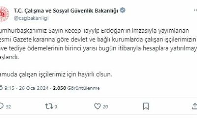 ÇALIŞMA ve Sosyal Güvenlik Bakanlığı, kamuda çalışan işçilerin ilave tediye ödemelerinin birinci yarısının bugün itibarıyla başladığını duyurdu. Bakanlığın sosyal medya hesabından yapılan açıklamada, “Cumhurbaşkanımız Sayın Recep...
