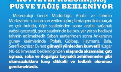 ANKARA Valiliği, kentin güney kesimlerinde kuvvetli rüzgar beklendiğini belirterek, çatı uçması ve karbonmonoksit zehirlenmelerine karşı uyardı. Valiliğin sosyal medya hesabından yapılan açıklamada, “Meteoroloji Genel Müdürlüğü Analiz...