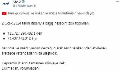 AFET ve Acil Durum Yönetimi Başkanlığı (AFAD), Kahramanmaraş merkezli depremlerden sonra bağış hesabında toplanan paranın 73 milyar 437 milyon 442 bin 312 TL’sinin afetzedelere ulaştırıldığını duyurdu. AFAD’ın...