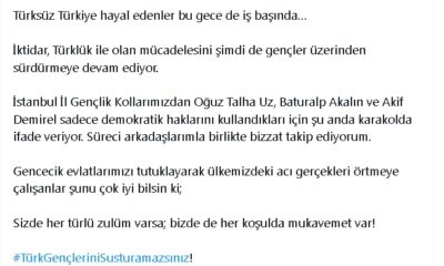 İYİ Parti Genel Başkanı Meral Akşener, gözaltına alınan 3 partili ile ilgili açıklama yaparak, “Türksüz Türkiye hayal edenler bu gece de iş başında. İstanbul İl Gençlik Kollarımızdan...