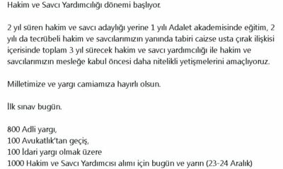 ADALET Bakanı Yılmaz Tunç, hakim ve savcı yardımcılığı döneminin başladığını belirterek, 1000 hakim ve savcı yardımcısı alımı için ilk sınavın bugün ve yarın gerçekleştirileceğini açıkladı. Hakimler...