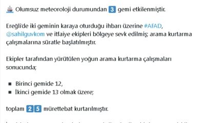 AFET ve Acil Durum Yönetimi Başkanlığı (AFAD), Zongluk’ta yaşanan olumsuz hava ve deniz koşullarından etkilenen 3 gemiden 2’sine ulaşılarak mürettebatın kurtarıldığını, içerisinde 12 mürettebat bulunan ve...