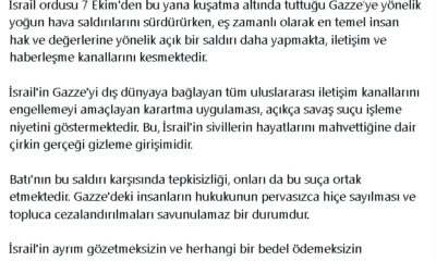 TÜRK Kızılay, Gazze’deki sabit hat, mobil telefon ve internet iletişiminin kesilmesi nedeniyle “Üzülerek belirtmeliyiz ki, Gazze’de görev yapan yerel ekibimizle iletişim kuramıyoruz. Maalesef hiçbir iletişim kanalı çalışmıyor ve...
