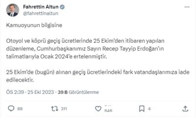 CUMHURBAŞKANLIĞI İletişim Başkanı Fahrettin Altun, köprü ve otoyol geçiş ücretlerine yapılan zammın Ocak 2024’e ertelendiğini açıkladı. Köprü ve otoyol geçiş ücretlerine 25 Ekim gece yarısından itibaren...