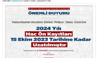DİYANET İşleri Başkanlığı, 2024 yılı hac ön kayıt işlemlerinin 15 Ekim 2023’e kadar uzatıldığını duyurdu. Diyanet İşleri Başkanlığı’nın sosyal medya hesabından yapılan açıklamada, “Son başvuru tarihi...