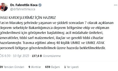 SAĞLIK Bakanı Fahrettin Koca, Fas’ın Marakeş kentinde meydana gelen 7 büyüklüğündeki depremin ardından Fas’a yardım amaçlı ekip ve ekipman gönderilmesi için çalışma başlattıklarını açıkladı. Bakan Koca,...