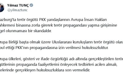 ADALET Bakanı Yılmaz Tunç, Fransa Strazburg’ta Avrupa İnsan Hakları Mahkemesi’nde (AİHM) PKK propagandası yapılmasına tepki göstererek, “Avrupa Birliği başta olmak üzere Uluslararası kuruluşların terör örgütü olarak...