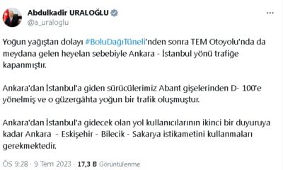 ULAŞTIRMA ve Altyapı Bakanı Abdulkadir Uraloğlu, yoğun yağış dolayısıyla Bolu Dağı Tüneli’nden sonra TEM Otoyolu’nda meydana gelen heyelan sebebiyle Ankara-İstanbul yönünün trafiğe kapandığını duyurdu. Anadolu Otoyolu’nun Bolu Dağı kesiminde...