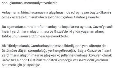 Dışişleri Bakanlığı: Ateşkesin sağlanmasıyla birlikte, insani bir felaketin yaşandığı Gazze’ye insani yardımların ulaştırılması ve Gazze’nin yeniden imarına yönelik çalışmaların ivedilikle başlatılması gerekmektedir. Türkiye bundan sonra da...