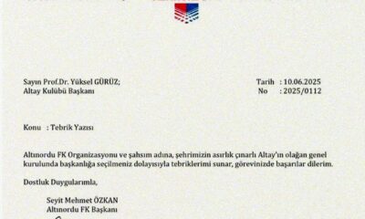 Siyah-beyazlı kulüpten yapılan açıklamada ise şu ifadelere yer verildi: “Altay Spor Kulübü olarak, Başkanımız Sayın Yüksel Gürüzün göreve seçilmesi dolayısıyla ilettikleri nazik tebrik mesajı için Dost...