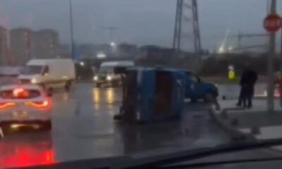 BAŞAKŞEHİR’de şoförünün direksiyon hakimiyetini kaybettiği kargo aracı viraja girerken devrildi. Aracın aynı anlarda geçen bir İETT otobüsüne çarpmaması olası faciayı önlerken, kaza anı güvenlik kamerasına yansıdı....