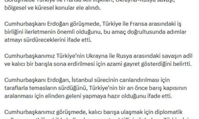 İletişim Başkanlığından yapılan açıklamaya göre; görüşmede Türkiye ile Fransa ikili ilişkileri, Ukrayna-Rusya savaşı, bölgesel ve küresel konular ele alındı. Cumhurbaşkanı Erdoğan görüşmede, Türkiye ile Fransa arasındaki...