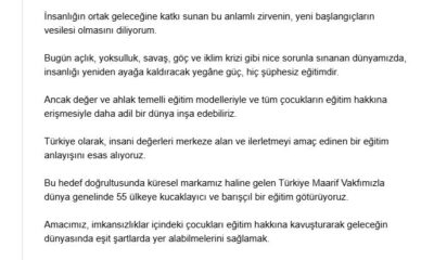 Cumhurbaşkanı Recep Tayyip Erdoğanın eşi Emine Erdoğan, zirvenin açılışına gönderdiği video mesajında, dünyanın, insanın içinde taşıdığı değerlerin özeti olduğunu belirterek, “Adil, güvenli, barışçıl bir düzen empati...