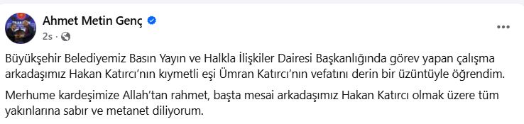 “Büyükşehir Belediyemiz Basın Yayın ve Halkla İlişkiler Dairesi Başkanlığında görev yapan çalışma arkadaşımız Hakan Katırcı’nın kıymetli eşi Ümran Katırcı’nın vefatını derin bir üzüntüyle öğrendim. Merhume kardeşimize Allah’tan rahmet, başta mesai arkadaşımız Hakan Katırcı olmak üzere tüm yakınlarına sabır ve metanet diliyorum.”