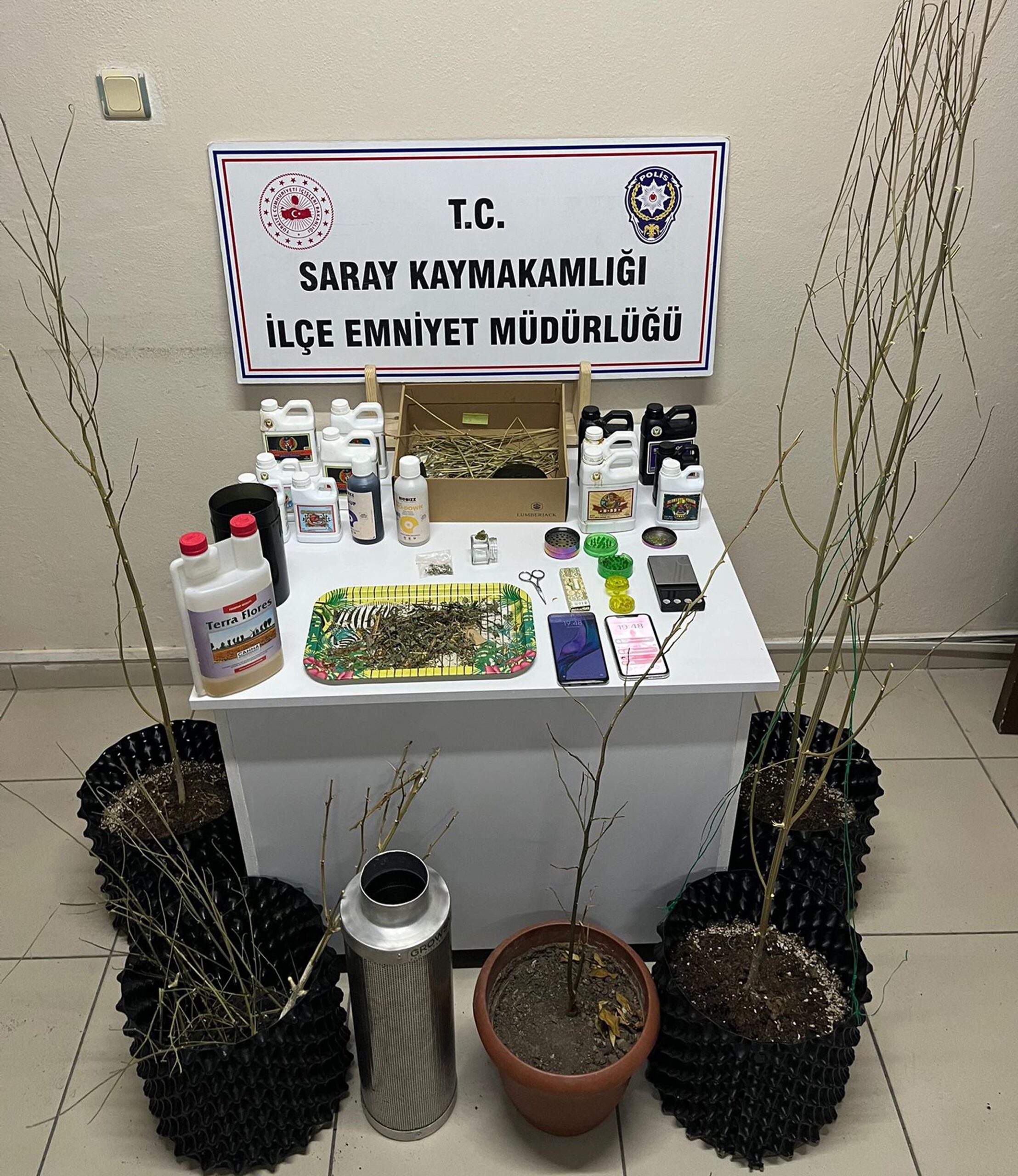 Tekirdağ İl Emniyet Müdürlüğü ile Saray İlçe Emniyet Müdürlüğü ekiplerinin yaptığı çalışmada, ilçede iki eve sistem kurarak kenevir yetiştirilip uyuşturucu üreterek piyasa sürdükleri belirlendi. Ekiplerin iki adrese eş zamanlı düzenlediği operasyonda, bitki üretim kabini, 5 saksı içerisinde ekili kenevir, 7 kutu suni sıvı gübre, 3 öğütücü, 1 hassas terazi, 14 gram Hint keneviri, çeşitli bitki üretiminde kullanılan malzemeler, ruhsatsız 4 tabanca ile 1 tüfek, silahlara ait 90 mermi ve fişek ele geçirildi. 5 kişi gözaltına alınırken, soruşturma sürüyor.