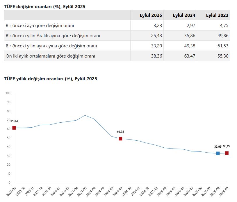TÜİK, Eylül 2025 dönemine ilişkin enflasyon verilerini açıkladı. Buna göre, tüketici fiyatları 2025 yılı Eylül ayında bir önceki aya göre yüzde 3,23, bir önceki yılın aralık ayına göre yüzde 25,43, bir önceki yılın aynı ayına göre yüzde 33,29 ve 12 aylık ortalamalara göre yüzde 38,36 arttı.