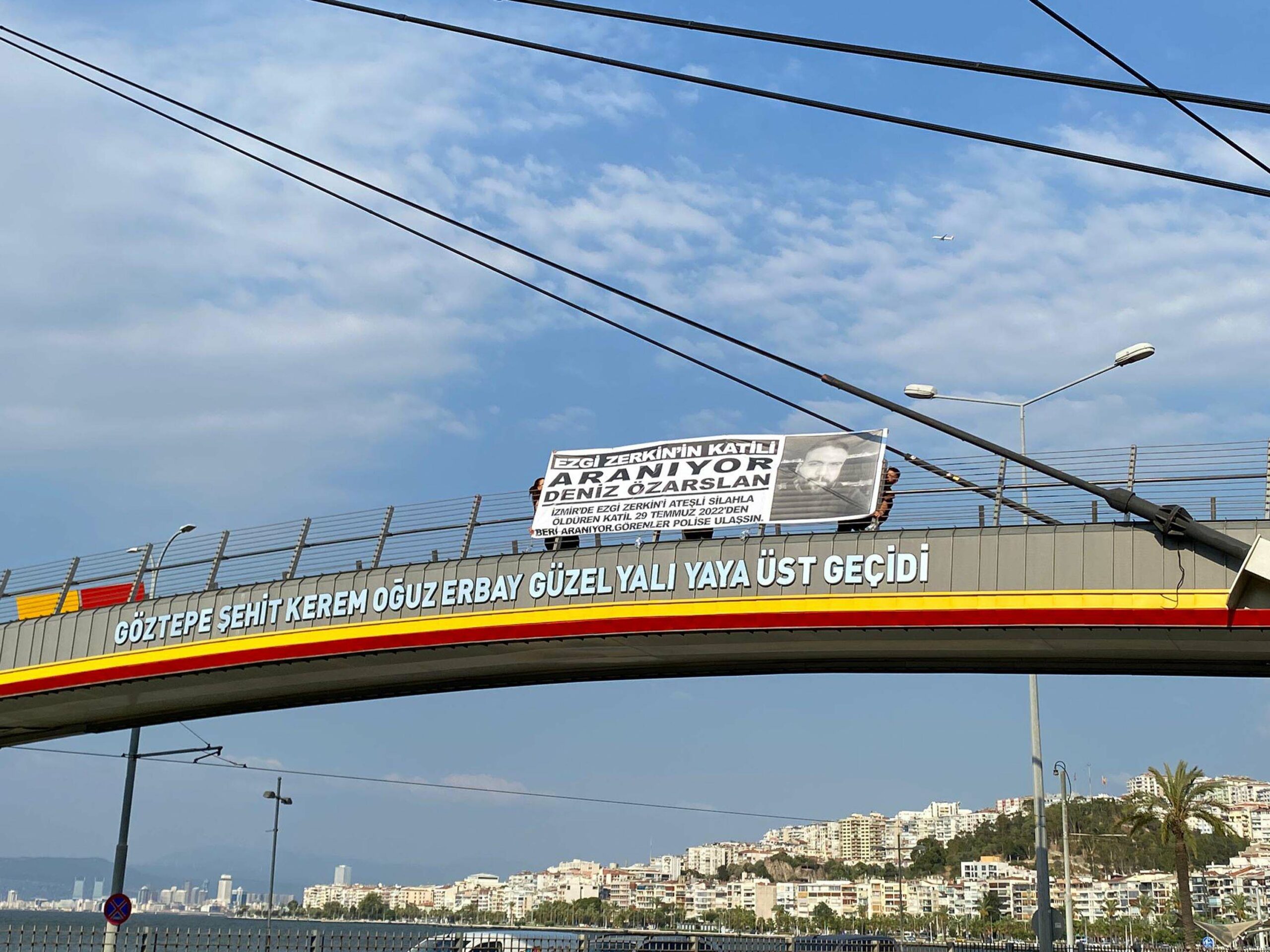 Ezgi’nin öldürülmesini üzerinden 382 gün geçmesine rağmen katil zanlısı Deniz Özarslan’ın yakalamaması üzerine ailesi, Konak ilçesi Güzalyalı semtindeki Şehit Kerem Oğuz Erbay Üst Geçidi’ne ‘Ezgi’nin katili aranıyor. İzmir’de Ezgi Zerkin’i ateşli silahla öldüren katil zanlısı 29 Temmuz 2022’den beri aranıyor. Görenler polise ulaşsın’ yazılı pankart astı.