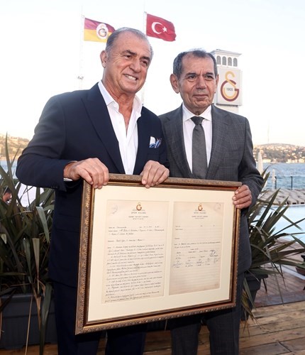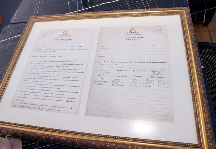 Başkan Dursun Özbek, günün anısına Fatih Terimin 50 yıl önceki transferi konusunda kulübün yönetim kurulunda alınan kararın belgesini hediye etti.
