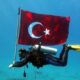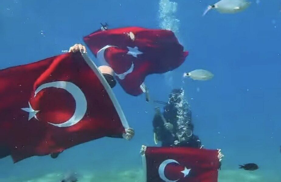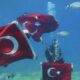 Fethiye’de düzenlenen etkinlikte profesyonel dalgıçlar, Cumhuriyet Bayramı coşkusunu deniz altında da yaşattı. Dalyan Koyu’nda dalgıçlar, Türk bayrağını 5 metre derinliğe indirerek su altında poz verdi. Renkli görüntülere sahne olan etkinlikte, ay yıldızlı bayrak katılımcılardan büyük alkış aldı.