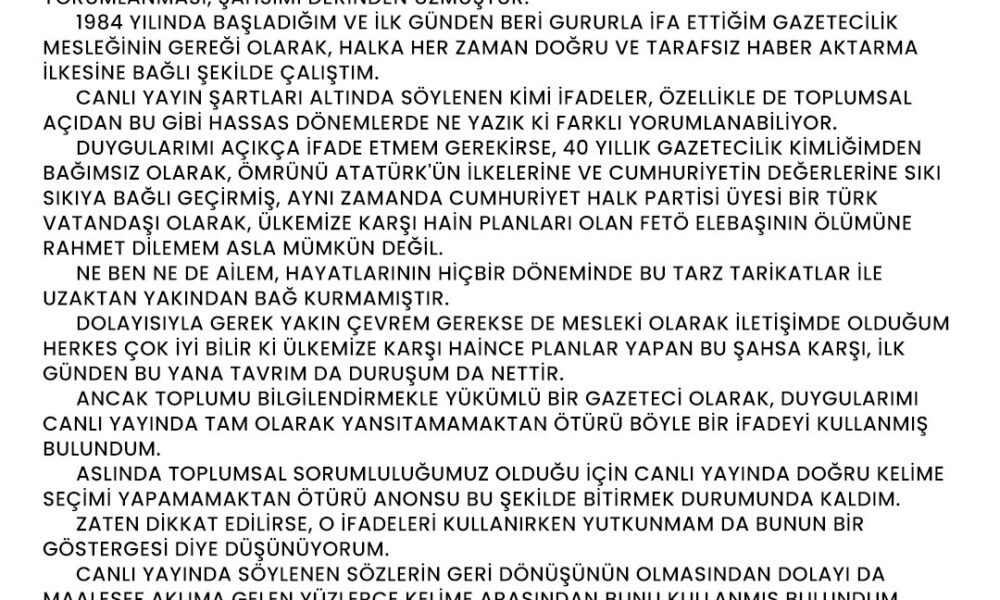 “Öncelikle bilinmesini isterim ki canlı yayın esnasında, toplumu bilgilendirmekle yükümlü bir gazeteci olarak kullanmış olduğum ifadelerin farklı şekilde yorumlanması, şahsımı derinden üzmüştür. 1984 yılında başladığım ve ilk günden beri gururla ifa ettiğim gazetecilik mesleğinin gereği olarak, halka her zaman doğru ve tarafsız haber aktarma ilkesine bağlı şekilde çalıştım. Canlı yayın şartları altında söylenen kimi ifadeler, özellikle de toplumsal açıdan bu gibi hassas dönemlerde ne yazık ki farklı yorumlanabiliyor. Duygularımı açıkça ifade etmem gerekirse, 40 yıllık gazetecilik kimliğimden bağımsız olarak, ömrünü Atatürkün ilkelerine ve cumhuriyetin değerlerine sıkı sıkıya bağlı geçirmiş, aynı zamanda Cumhuriyet Halk Partisi üyesi bir Türk vatandaşı olarak, ülkemize karşı hain planları olan FETÖ elebaşının ölümüne rahmet dilemem asla mümkün değil. Ne ben ne de ailem, hayatlarının hiçbir döneminde bu tarz tarikatlar ile uzaktan yakından bağ kurmamıştır. Dolayısıyla gerek yakın çevrem gerekse de mesleki olarak iletişimde olduğum herkes çok iyi bilir ki ülkemize karşı haince planlar yapan bu şahsa karşı, ilk günden bu yana tavrım da duruşum da nettir. Ancak toplumu bilgilendirmekle yükümlü bir gazeteci olarak, duygularımı canlı yayında tam olarak yansıtamamaktan ötürü böyle bir ifadeyi kullanmış bulundum. Aslında toplumsal sorumluluğumuz olduğu için canlı yayında doğru kelime seçimi yapamamaktan ötürü anonsu bu şekilde bitirmek durumunda kaldım. Zaten dikkat edilirse, o ifadeleri kullanırken yutkunmam da bunun bir göstergesi diye düşünüyorum. Canlı yayında söylenen sözlerin geri dönüşünün olmamasından dolayı da maalesef aklıma gelen yüzlerce kelime arasından bunu kullanmış bulundum. Fakat insani duygularla söylenmiş bir cümlenin bu denli çarpıtılması gerçekten üzücü. Bu yüzden, farklı bir algıya neden olan bu hatalı sözlerimden dolayı şahsım ve kurumum adına kamuoyundan özür diliyorum. Anlayışınız ve desteğiniz için teşekkür ederim.”
