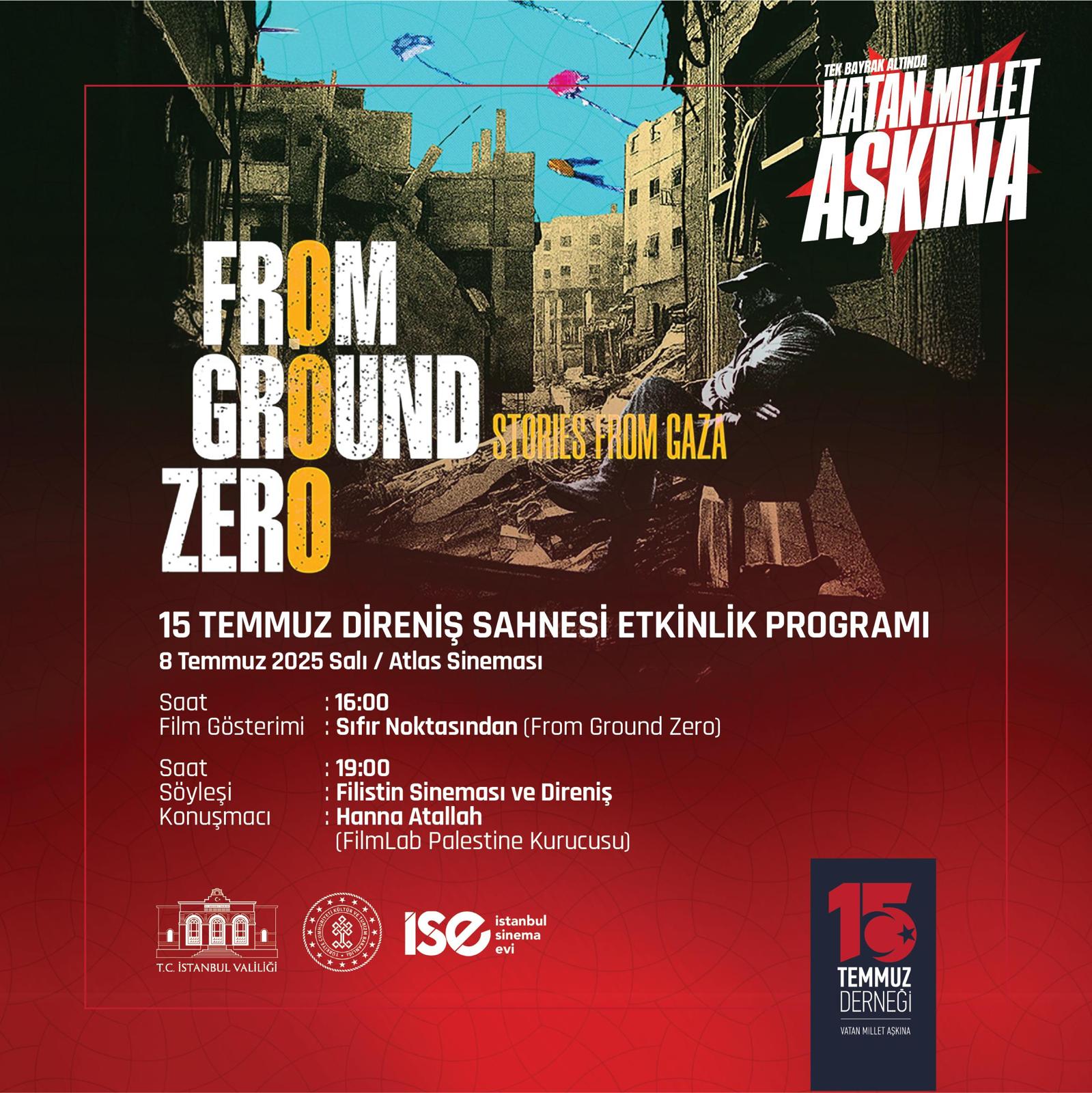 Bakanlıktan yapılan yazılı açıklamada, “Kültür ve Turizm Bakanlığı Sinema Genel Müdürlüğünün desteğiyle, 15 Temmuz Derneği tarafından düzenlenen 15 Temmuz Direniş Sahnesi etkinlikleri kapsamında Filistin halkının yaşadığı büyük acıları sinema perdesine taşıyan özel bir gösterim ve söyleşi programı gerçekleştirilecek. 8 Temmuz Salı günü İstanbul Beyoğlundaki Atlas Sinemasında düzenlenecek etkinlikte, Gazzede yaşananlara sinema aracılığıyla tanıklık eden Sıfır Noktasından (From Ground Zero) adlı film saat 16.00da izleyiciyle buluşacak. 22 genç Filistinli yönetmenin katkısıyla hazırlanan film, devam eden çatışmaların merkezinden yükselen kişisel hikayeleri beyaz perdeye taşıyor. Film, daha önce birçok uluslararası festivalde gösterilmiş ve dikkat çekici tepkiler almıştı” denildi.
