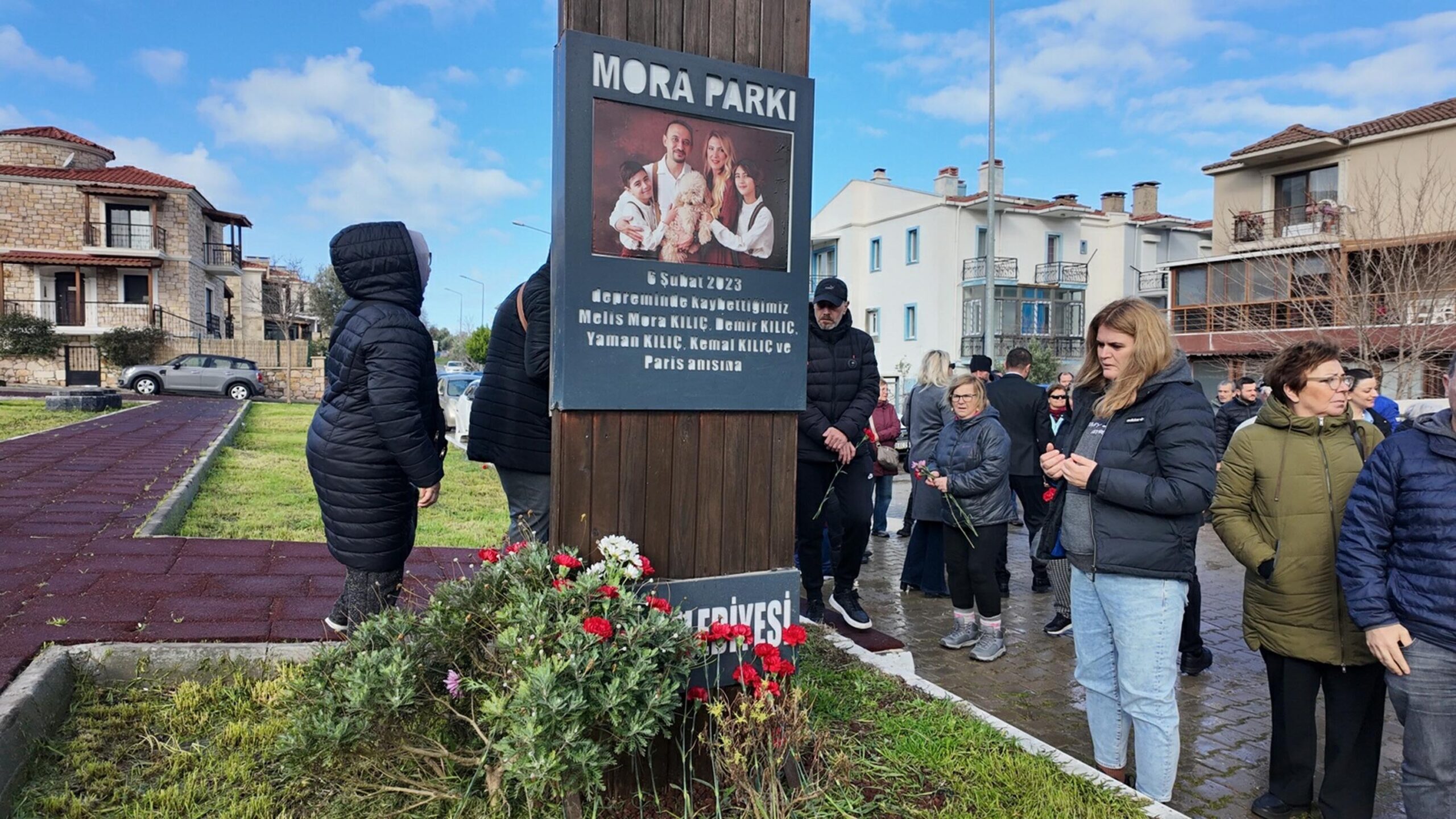 Parkta depremde ölen ailenin fotoğraflarının bulunduğu noktaya kırmızı karanfillerin bırakılması ve taziyelerle anma töreni sona erdi.