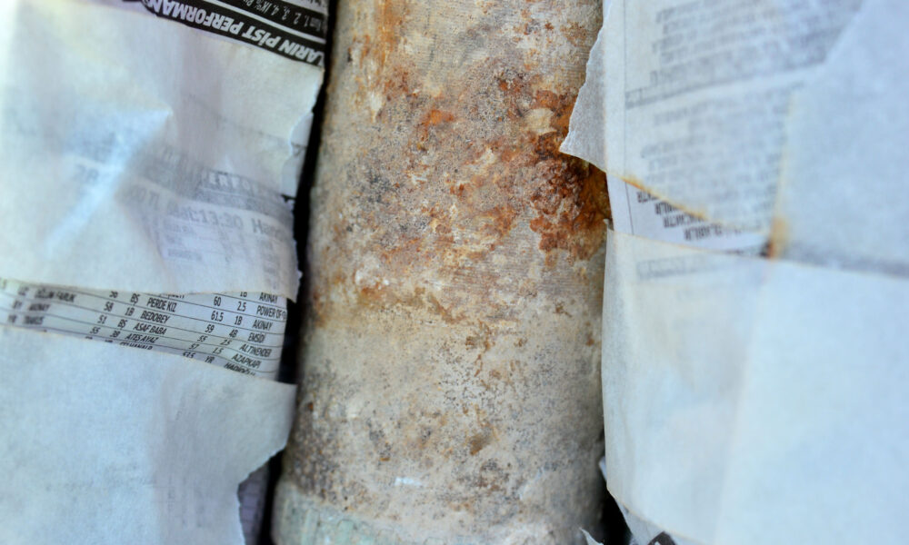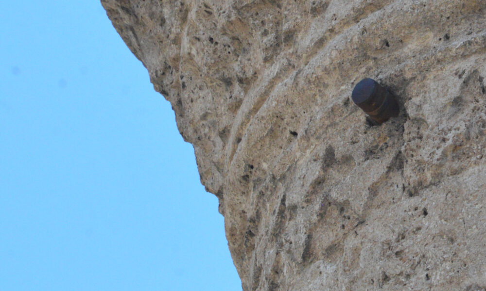 • Kahramanmaraş depremlerinde yıkılan tarihi Şeyh Turan Camii’nin minaresinde 103 yıldır patlamadan duran 75 milimetrelik top mermisi, depremden 20 ay sonra cami enkazından bulunarak koruma altına alındı. Fotoğraf: Ömer KOÇ/Kahramanmaraş, (DHA)