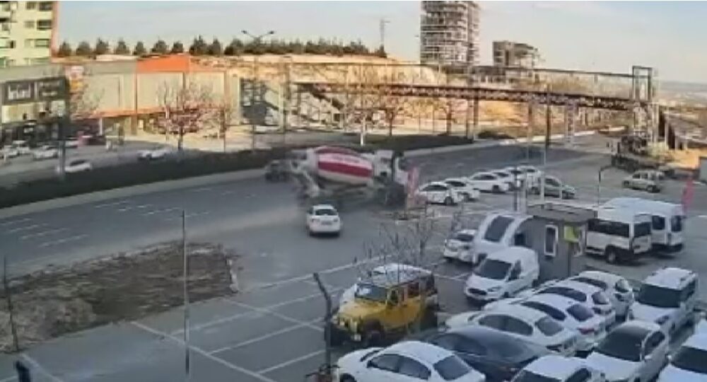 • ANKARA'DA, FRENI PATLAYAN BETON MIKSERI YOL KENARINDAKI OTOMOBILLERE CARPARAK DURABILDI. BETON MIKSERININ OTOMOBILLERI HURDA YIGININA CEVIRDIGI KAZA ANI GUVENLIK KAMERALARINA YANSIDI. FOTO: ANKARA-DHA