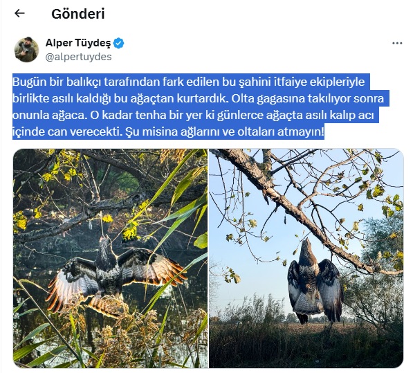 Ekipler ile birlikte olay yerine giden doğa fotoğrafçısı Alper Tüydeş, sosyal medya hesabından şahinin oltaya takılı fotoğrafını paylaşıp, “Bugün bir balıkçı tarafından fark edilen bu şahini itfaiye ekipleriyle birlikte asılı kaldığı bu ağaçtan kurtardık. Olta gagasına takılıyor sonra onunla ağaca. O kadar tenha bir yer ki günlerce ağaçta asılı kalıp acı içinde can verecekti. Şu misina ağlarını ve oltaları atmayın” dedi.