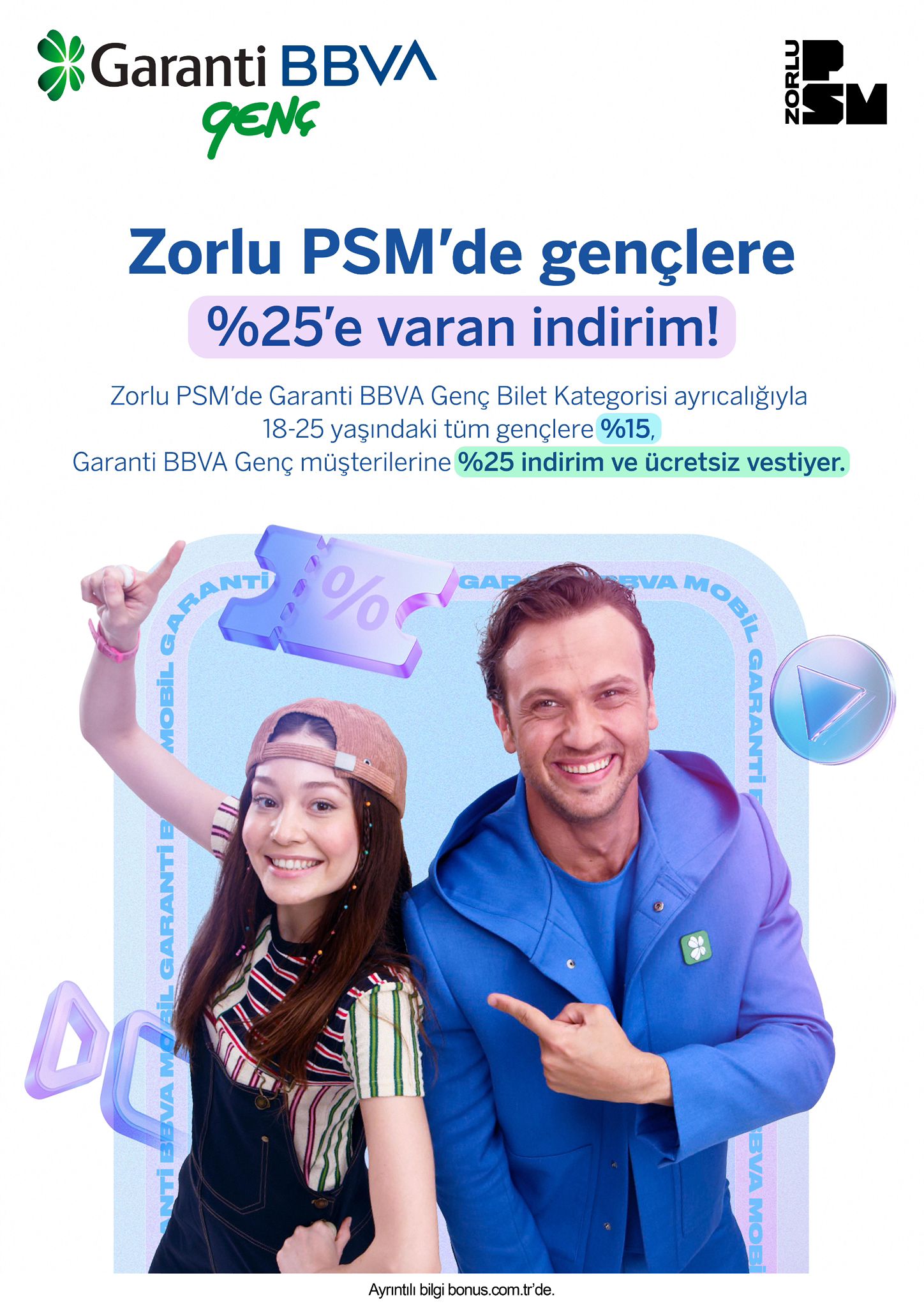 Yeni kategori Zorlu PSM’nin anlaşmalı olduğu bilet satış platformuve biletin üzerinde Garanti BBVA Genç Bilet adıyla yer alacak. Böylece gençler hem online hem de mekân içi iletişim kanallarında Garanti BBVA’nın desteğini görecekler.